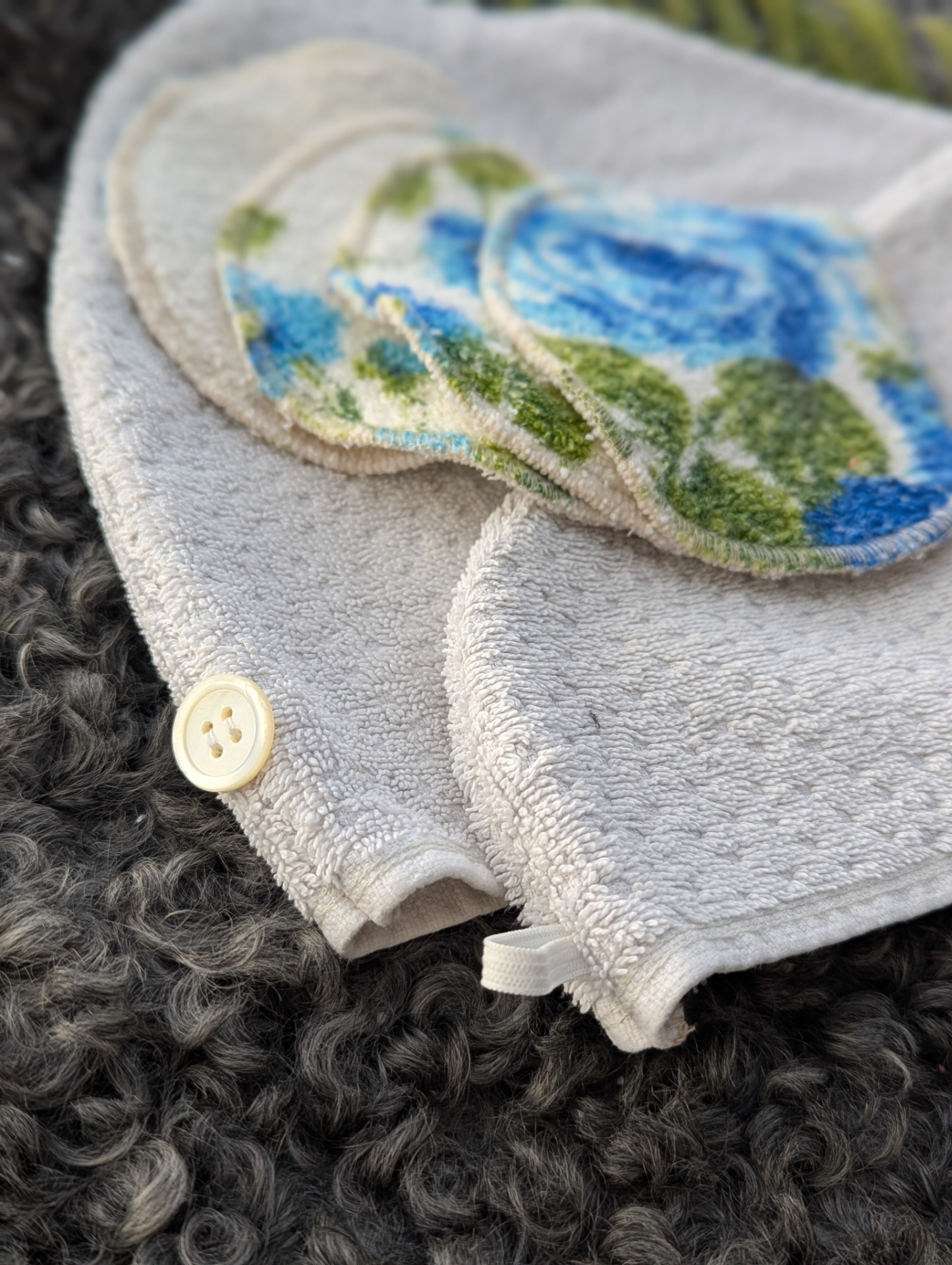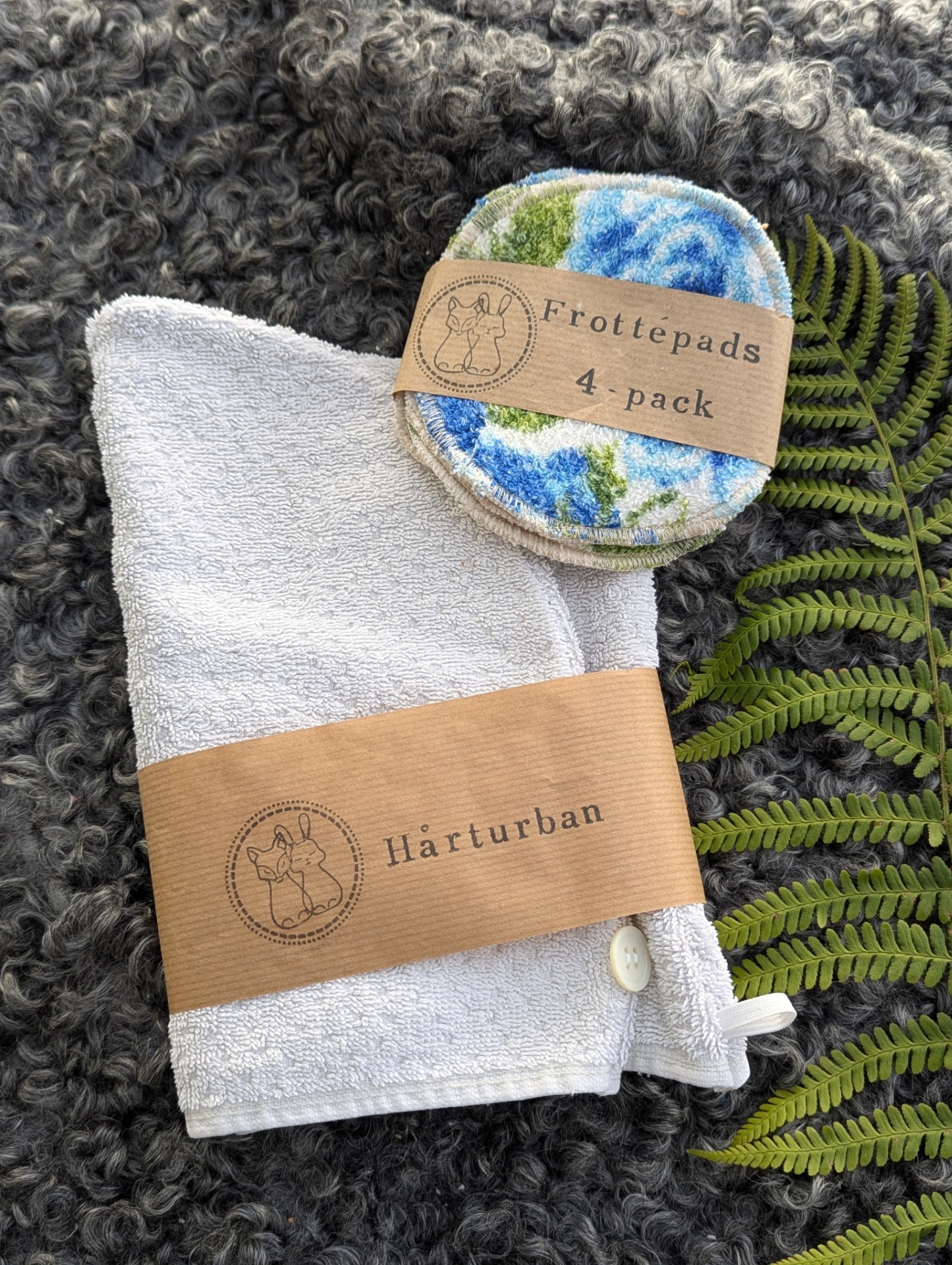 Ge dig själv eller någon du tycker om en komplett och hållbar start på hudvårdsrutinen – med vårt frottépaket som innehåller både en handsydd hårturban och ett 4-pack rengöringspads i återbrukad frotté.