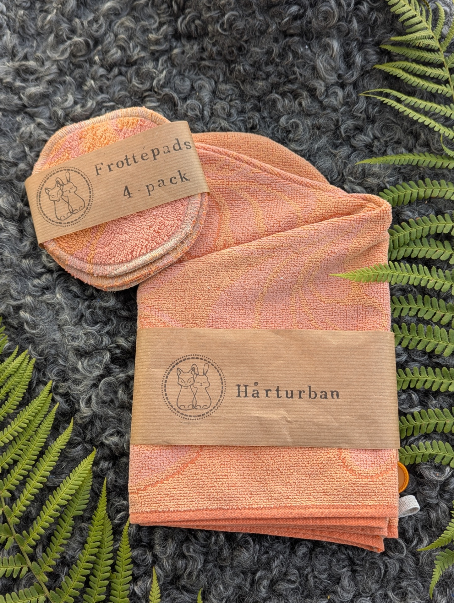 Ge dig själv eller någon du tycker om en komplett och hållbar start på hudvårdsrutinen – med vårt frottépaket som innehåller både en handsydd hårturban och ett 4-pack rengöringspads i återbrukad frotté.