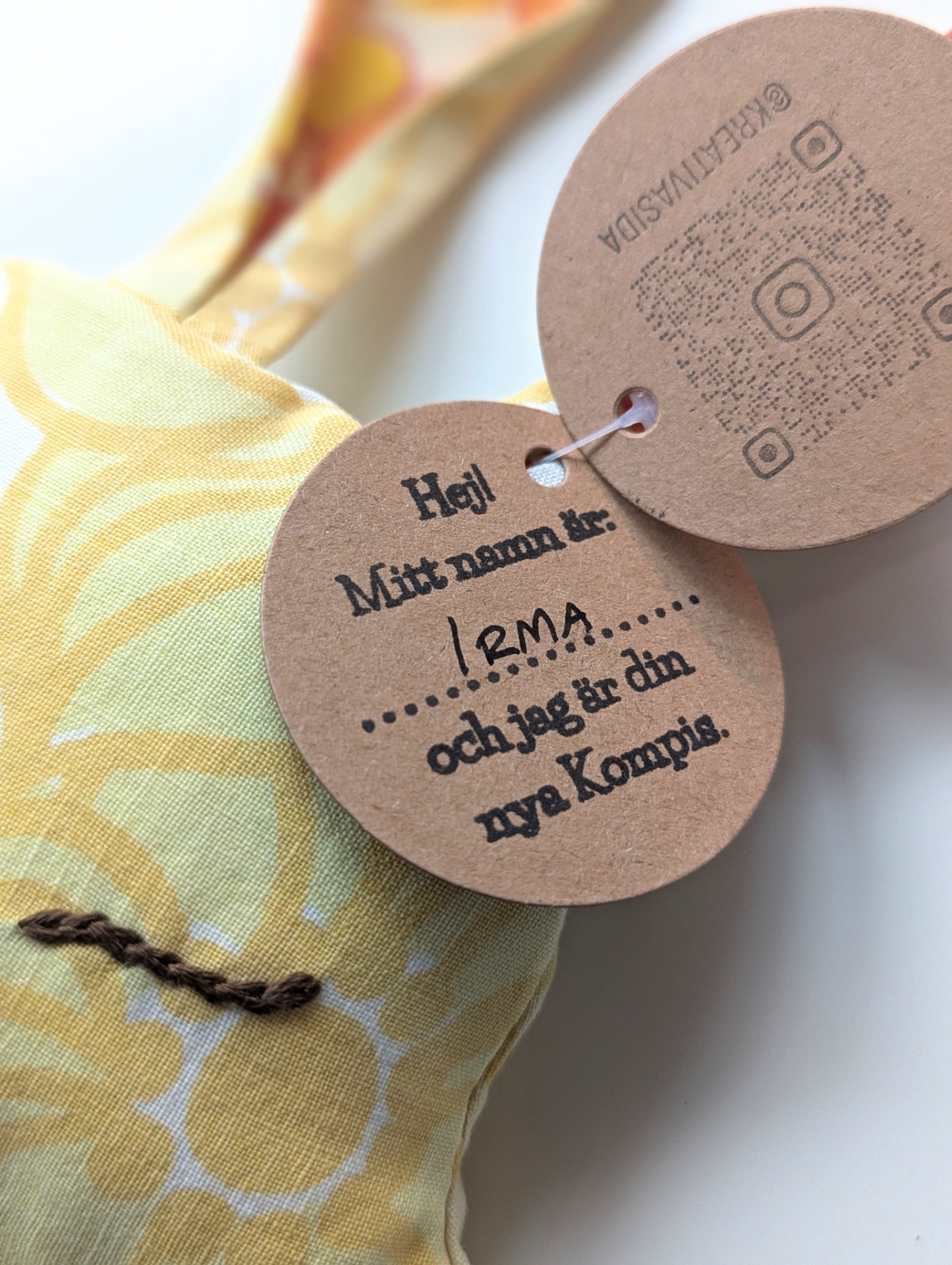 Varje handsydd Kompis är fylld med ekologiskt havre och väger omkring 400 gram. Den kan värmas i mikrovågsugnen eller kylas i frysen efter behov. Kompisen mäter ca. 35x14 cm och är perfekt anpassad för både små som stora barn.