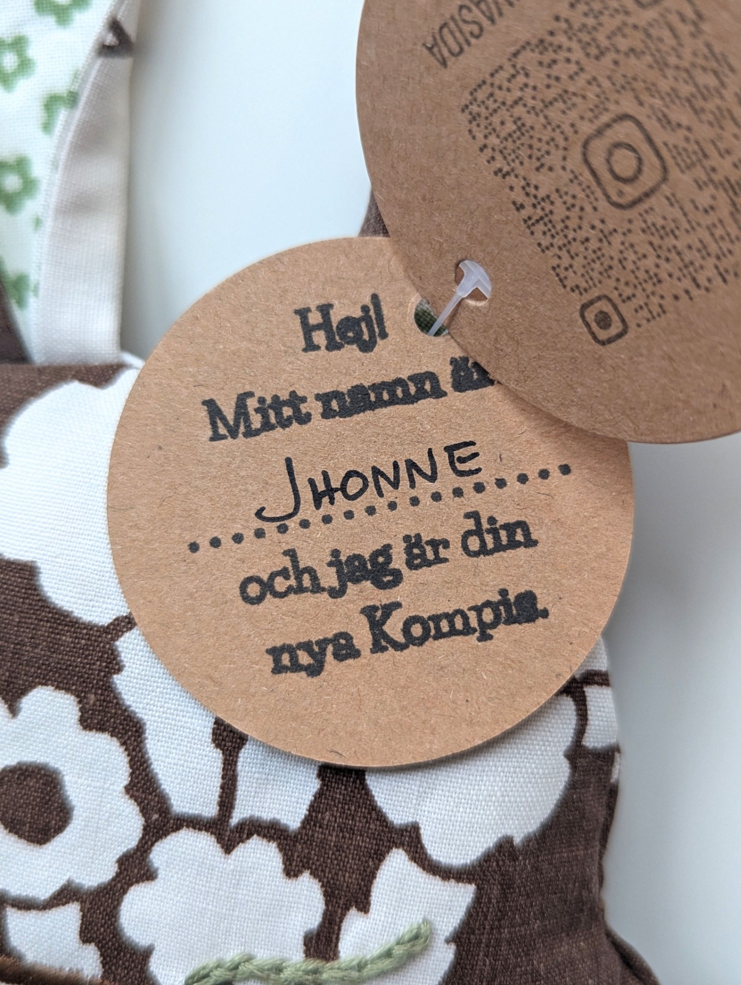 Varje handsydd Kompis är fylld med ekologiskt havre och väger omkring 400 gram. Den kan värmas i mikrovågsugnen eller kylas i frysen efter behov. Kompisen mäter ca. 35x14 cm och är perfekt anpassad för både små som stora barn.