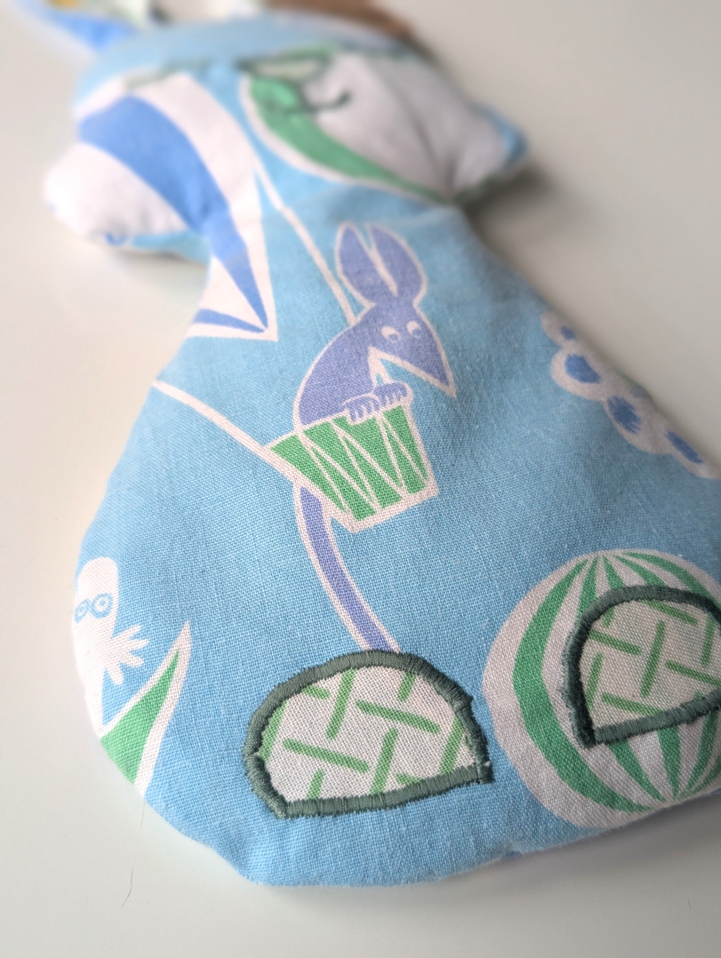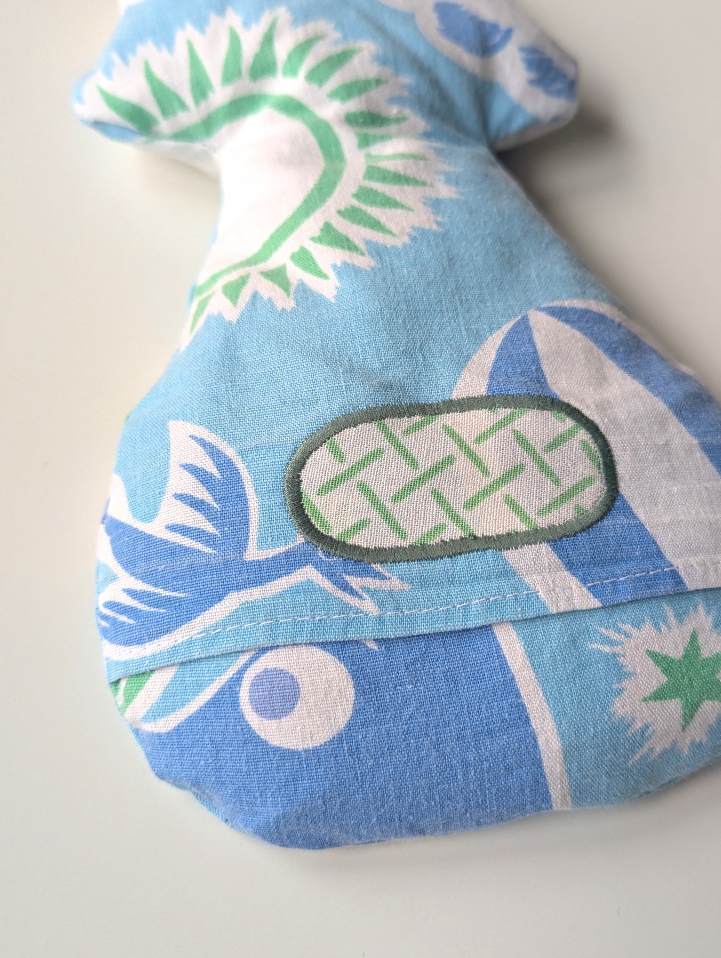 Praktiskt avtagbart ytterfoder i återbrukad bomullstextil, som tål maskintvätt i upp till 60grader. En funktion jag själv ofta saknat i andra traditionella vetevärmare. Det havrefyllda innerfodret bör inte blötas, men det kan effektivt rengöras med bikarbonat eller något liknande för att hållas fräscht.