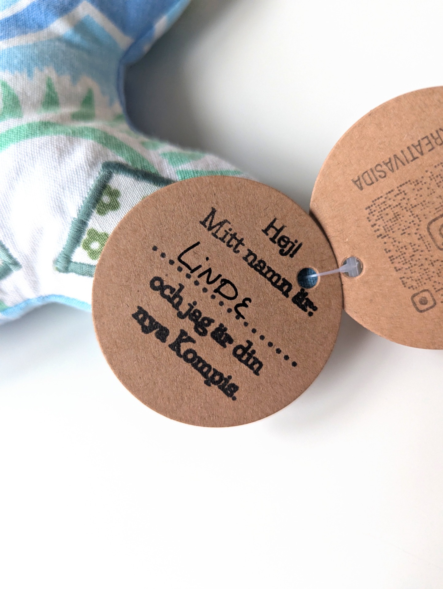 Varje handsydd Kompis är fylld med ekologiskt havre och väger omkring 450. gram. Den kan värmas i mikrovågsugnen eller kylas i frysen efter behov. Kompisen mäter ca. 30x14 cm och är perfekt anpassad för både små som stora barn.