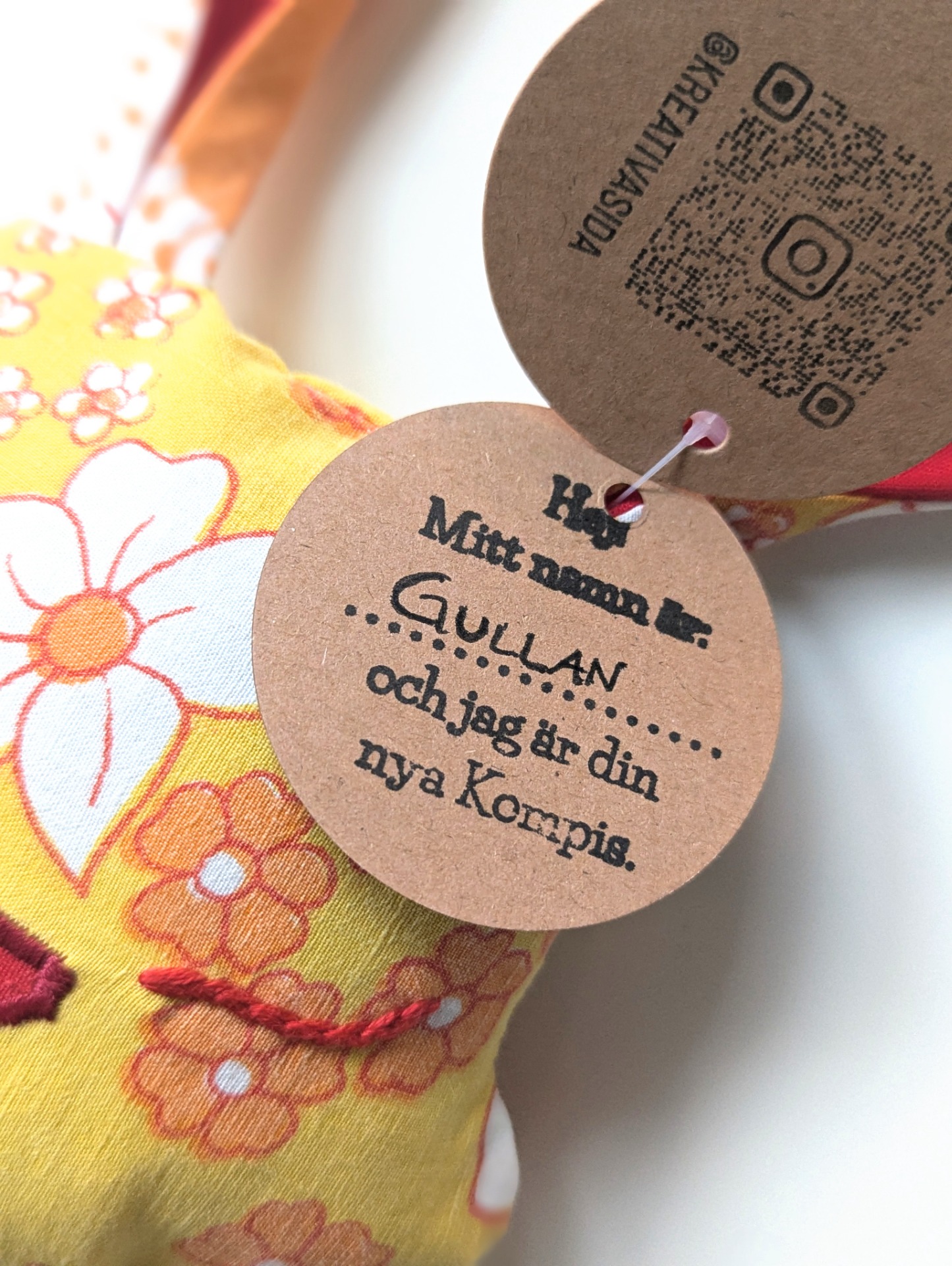 Varje handsydd Kompis är fylld med ekologiskt havre och väger omkring 400 gram. Den kan värmas i mikrovågsugnen eller kylas i frysen efter behov. Kompisen mäter ca. 35x14 cm och är perfekt anpassad för både små som stora barn.