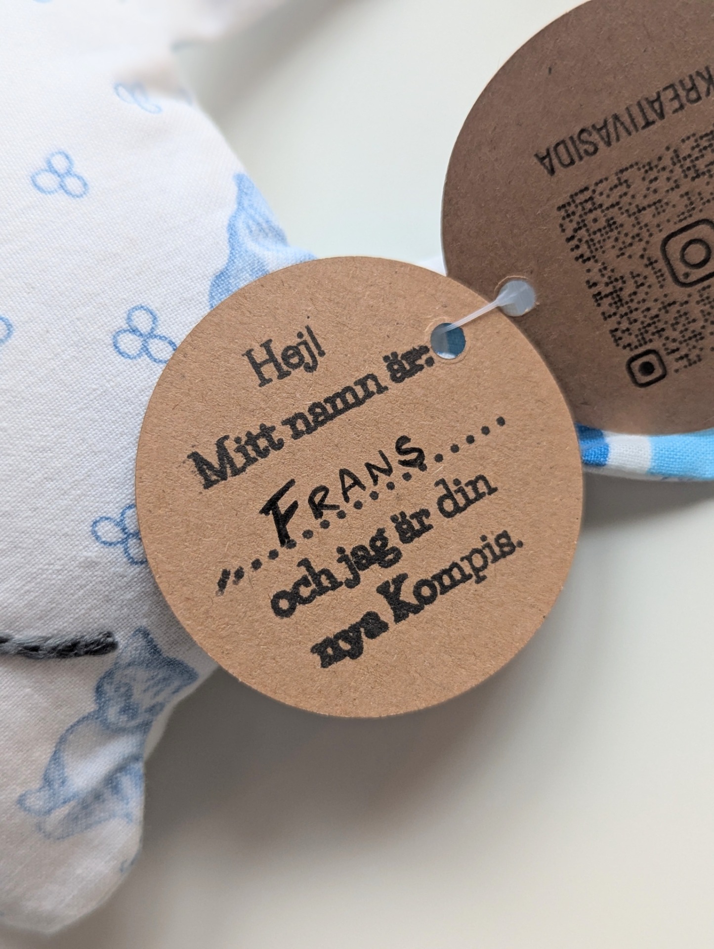 Varje handsydd Kompis är fylld med ekologiskt havre och väger omkring 400 gram. Den kan värmas i mikrovågsugnen eller kylas i frysen efter behov. Kompisen mäter ca. 35x14 cm och är perfekt anpassad för både små som stora barn.